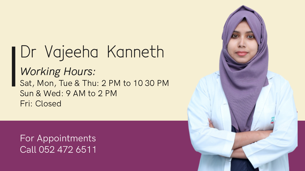 Dr. Vajeeha Kanneth is practicing as General Dentist at Abeer Al Noor Polyclinic, Qusais. She graduated from MES Medical College in Kerala in India with Bachelor of Dental Surgery degree in 2014. She has pursued her career as General Dentist since then. She has also taken varied advanced courses in the subject refining her skill sets.